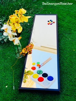 Whoop, whoop! Summer is here, and regardless of the ongoing pandemic, we need to keep the children in high spirits and engaged. Children always enjoy exploring paint; how it drips, covers, and mixes on surfaces. For this fun activity, all that is required is a large mirror as a canvass,( in my case, I used my IKEA hanging mirror), a recycled bottle as a vase and some flowers for inspiration.
